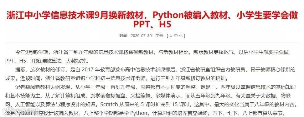 浙江省发布消息,秋季新学期三到九年级信息技术课将同步替换新教材。八年级新增Python内容,大数据、人工智能、程序设计与算法按照教材规划五六年级开始接触。