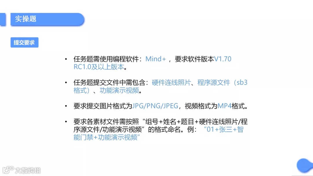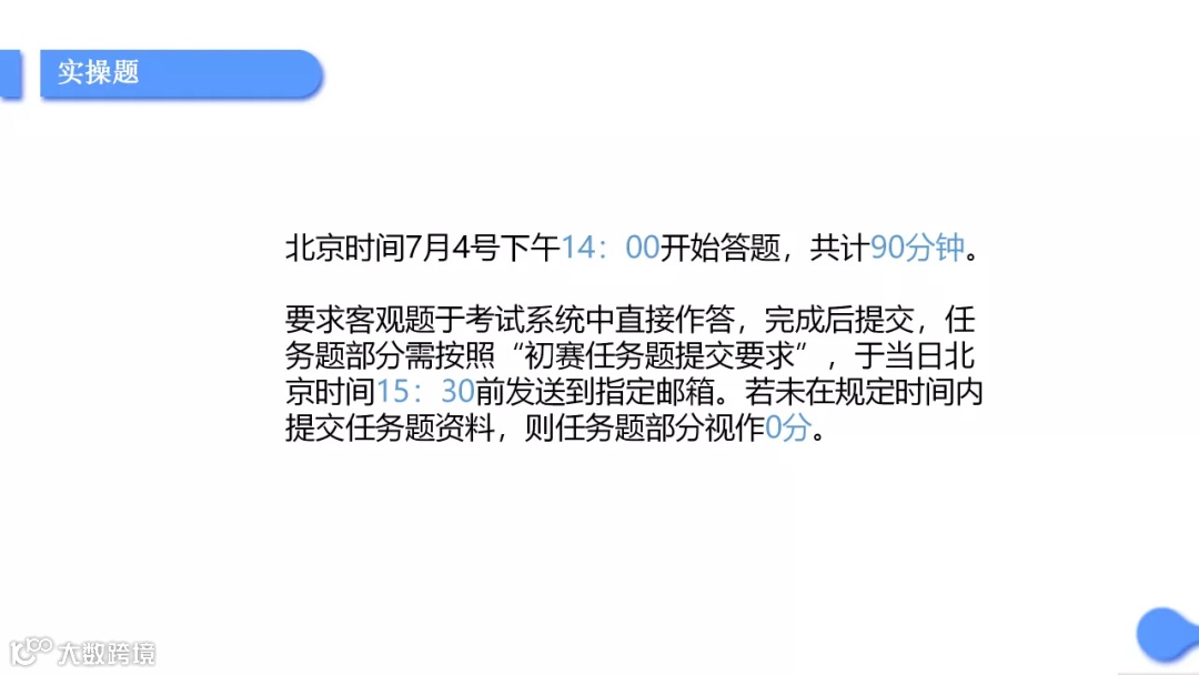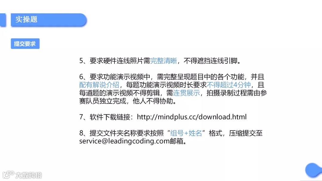 答:硬件初赛先完成客观题部分,选择题完成好之后不要直接点击交卷,一定要把实操题记录好之后再交卷,或者等实操题完成好之后统一交卷。一旦交卷后就无法再重新进入,也无法查看试题,所以参赛学生一定要确保在不影响实操题操作的情况下再交卷。硬件的比赛时间是90分钟,包括线上答题和实体操作,参赛学生要在90分钟内将比赛素材整理好发送到指定邮箱: