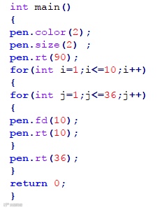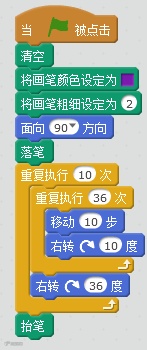 以绘制花环为例,scratch只需要几个简单模块的叠加,就能达到这种效果☟