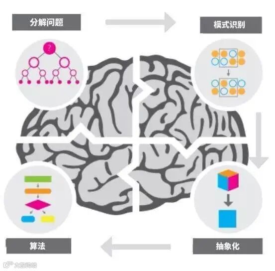 计算思维一般分为四个步骤:分解、模式识别、抽象化和算法。上述所说的例子其实就基本用到了这四个步骤。