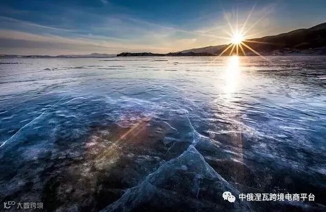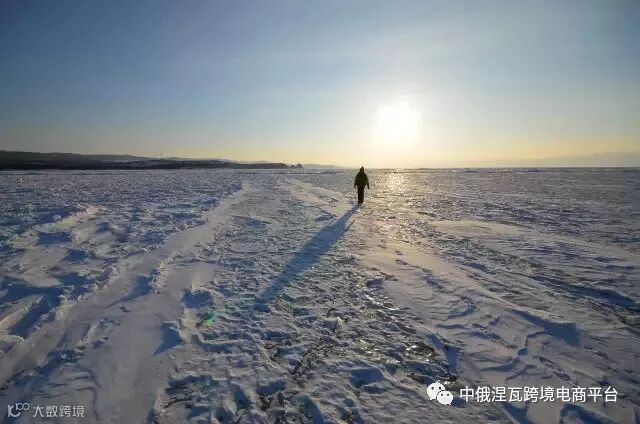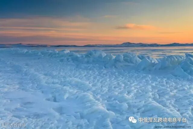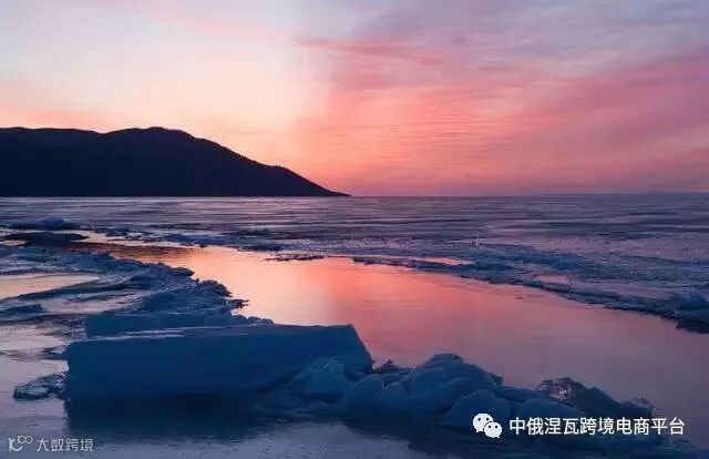 被夕阳映衬的更为这片冰湖增添了一抹淡红,似乎为贝加尔湖增添了些许温暖。