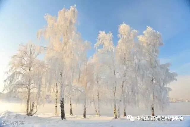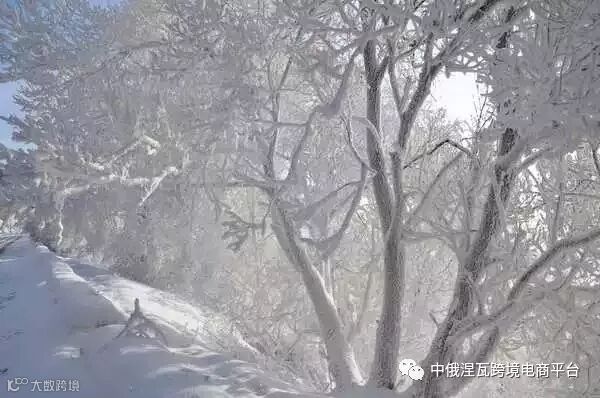 树木上挂满了白色的粒状水结晶,这就是洁白的雾凇,仿佛是那高贵浪漫的水晶,真是一种令人兴奋的美妙景色。