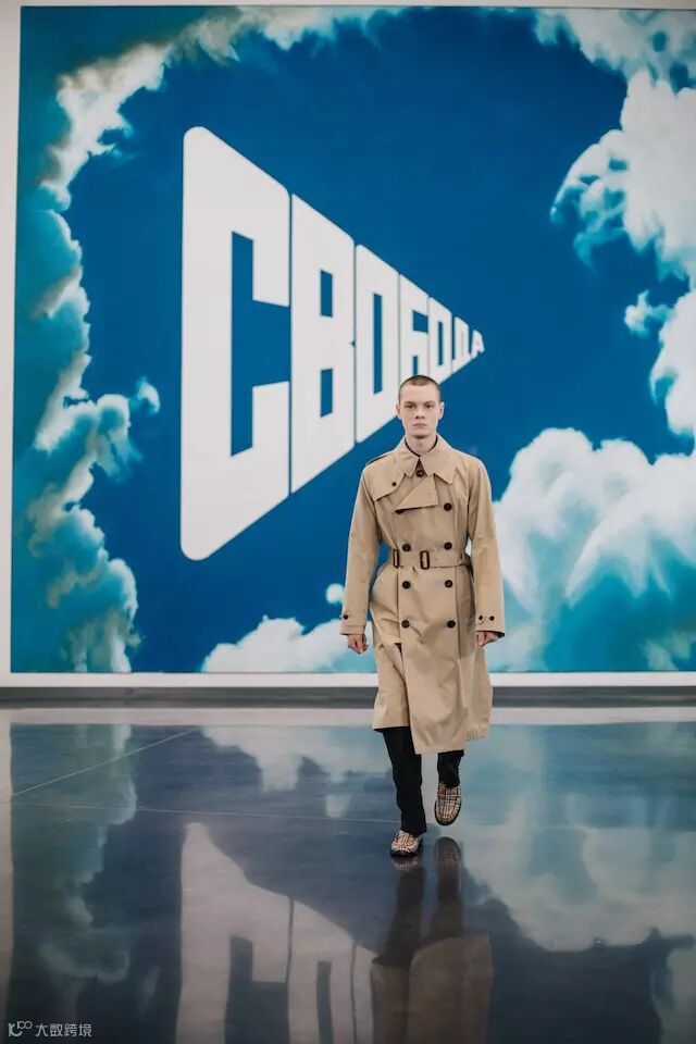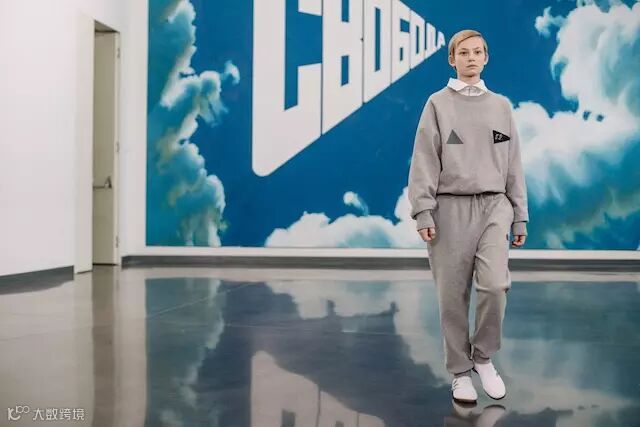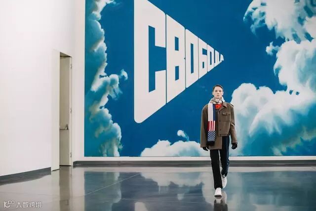 俄罗斯叶卡捷琳堡,Gosha Rubchinskiy 刚刚在这里举办了 2018 秋冬走秀。在叶利钦博物馆里,模特从一幅俄罗斯艺术家 Erik Bulatov 的作品中走出,那是 Bulatov 经典的作品形象,蓝色的天空中,写着斯拉夫字母:自由。