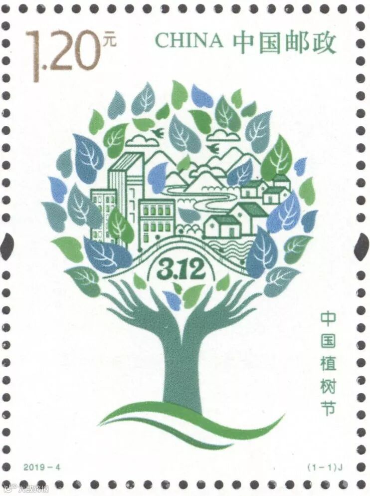 据介绍,1979年,五届全国人大常委会第六次会议决定,将每年的3月12日定为中国的植树节。首枚植树节纪念邮票,画面上是两只向上托起的手抽象处理化作树干,张开的五指意化为树枝,象征人人亲手植绿播绿,共同改善地球的生态环境。双手托起处有植树节的日期“3.12”。树干枝头上方是生机盎然的绿叶,层层绿叶中点缀了城镇乡村、河流山川和飞鸟白云,寓意通过植树造林,共同建设绿水青山的美丽中国。邮票印制使用绿色系专色油墨,在紫外灯光下会展现枝繁叶茂的景致、“40”和“履行植树义务,共建美丽中国”字样。