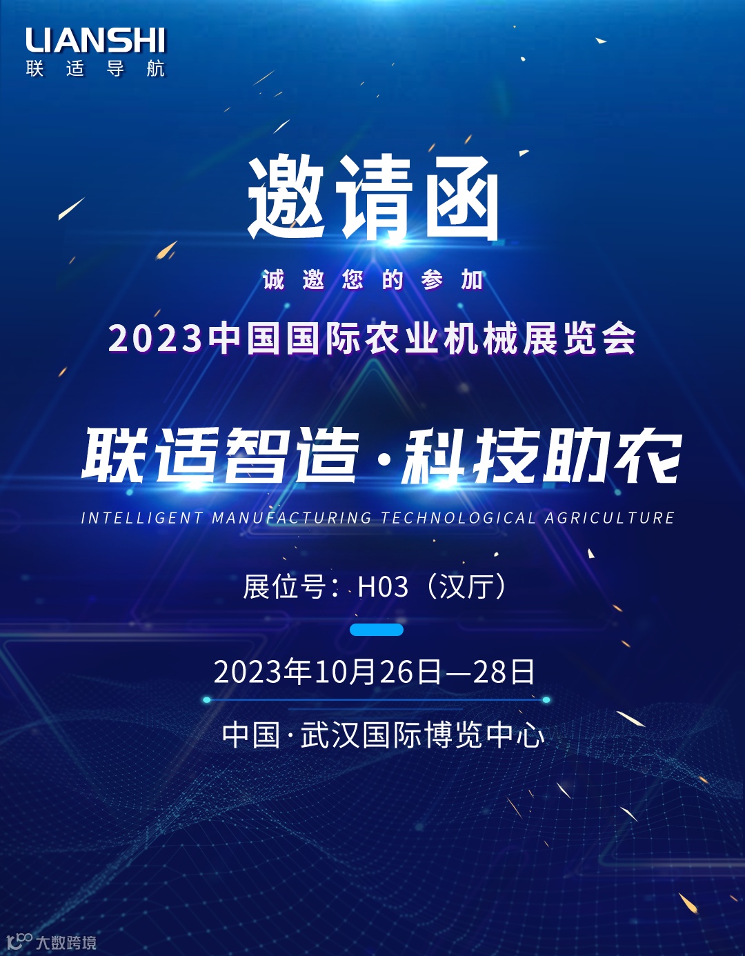 2023中国国际农业机械展览会(以下简称“国际农机展”)将于2023年10月26日-28 日在武汉国际博览中心举办。作为全球农机品牌展会,国际农机展具有深厚的历史背景和巨大行业影响力。联适导航受邀参展,亮相(汉厅)H03。