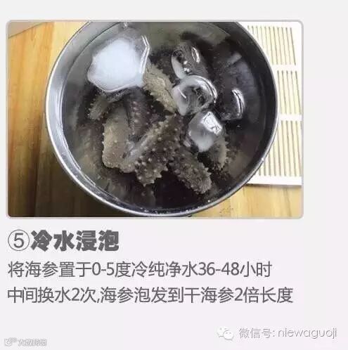 将海参置于冷纯净水中(放冰箱保鲜层),浸泡36-48小时左右(每隔12小时换水一次),直至将海参泡软为止。