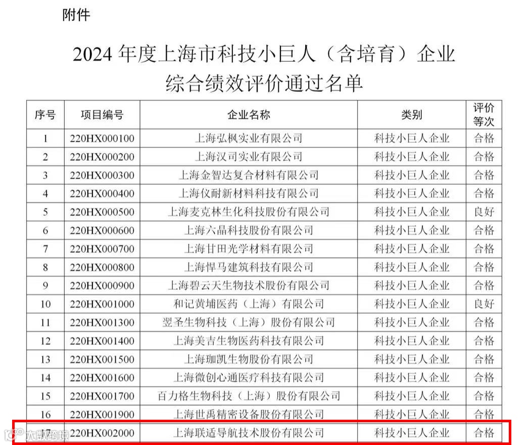 10月8日,根据上海市科学技术委员会、上海市经济和信息化委员会、上海市财政局下发的《关于开展2024年度上海市科技小巨人(含培育)企业综合绩效评价工作的通知》,上海联适导航技术股份有限公司评价结果为“合格”。