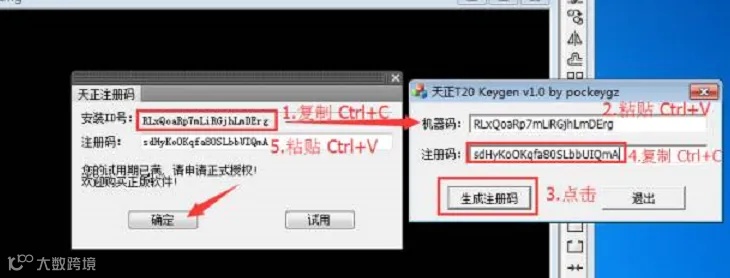 14.把安装ID号复制到注册机的机器码中,然后点击生成注册码,再将生成的注册码复制到注册机的注册码处。最后点击【确定】。