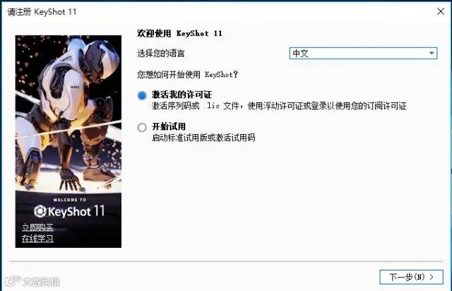 9,打开软件选择默认语言为中文,然后点击激活我的许可证,将生成的.ilc文件和keyshot.exe复制到软件的安装路径下替换,然后点击下一步