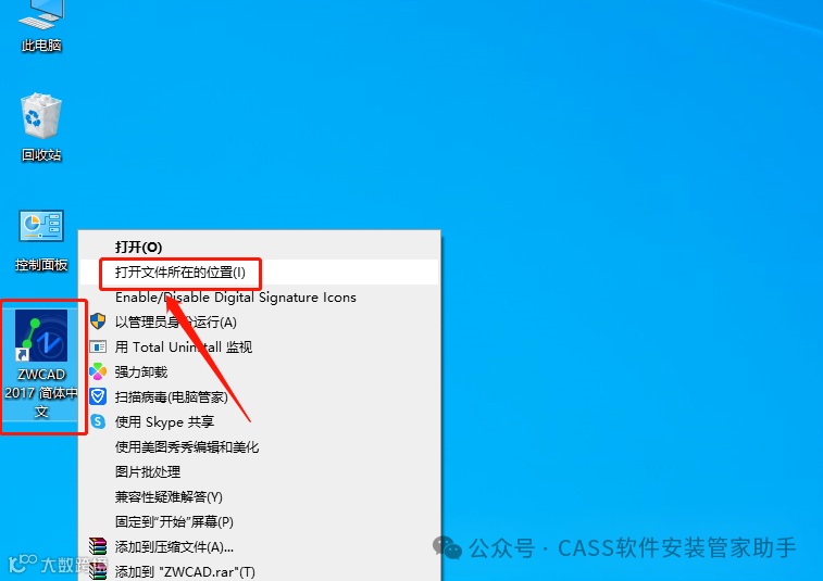 14.在桌面上找到ZWCAD-2017软件图标,鼠标右击选择【打开文件所在的位置】。