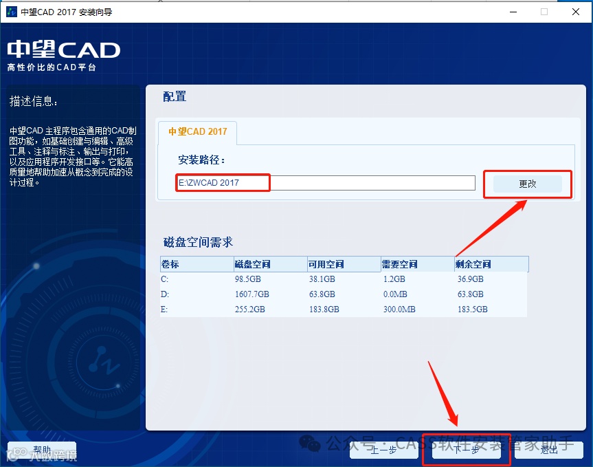 8.点击【更改】可设置软件的安装路径,可自行设置,教程中是安装到E盘新建的一个文件夹中,设置好安装路径后点击【下一步】。