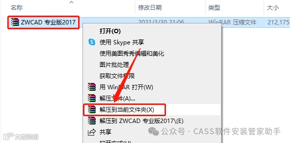 1.下载中望CAD2017软件安装包,鼠标右击压缩包选择【解压到当前文件夹 】。