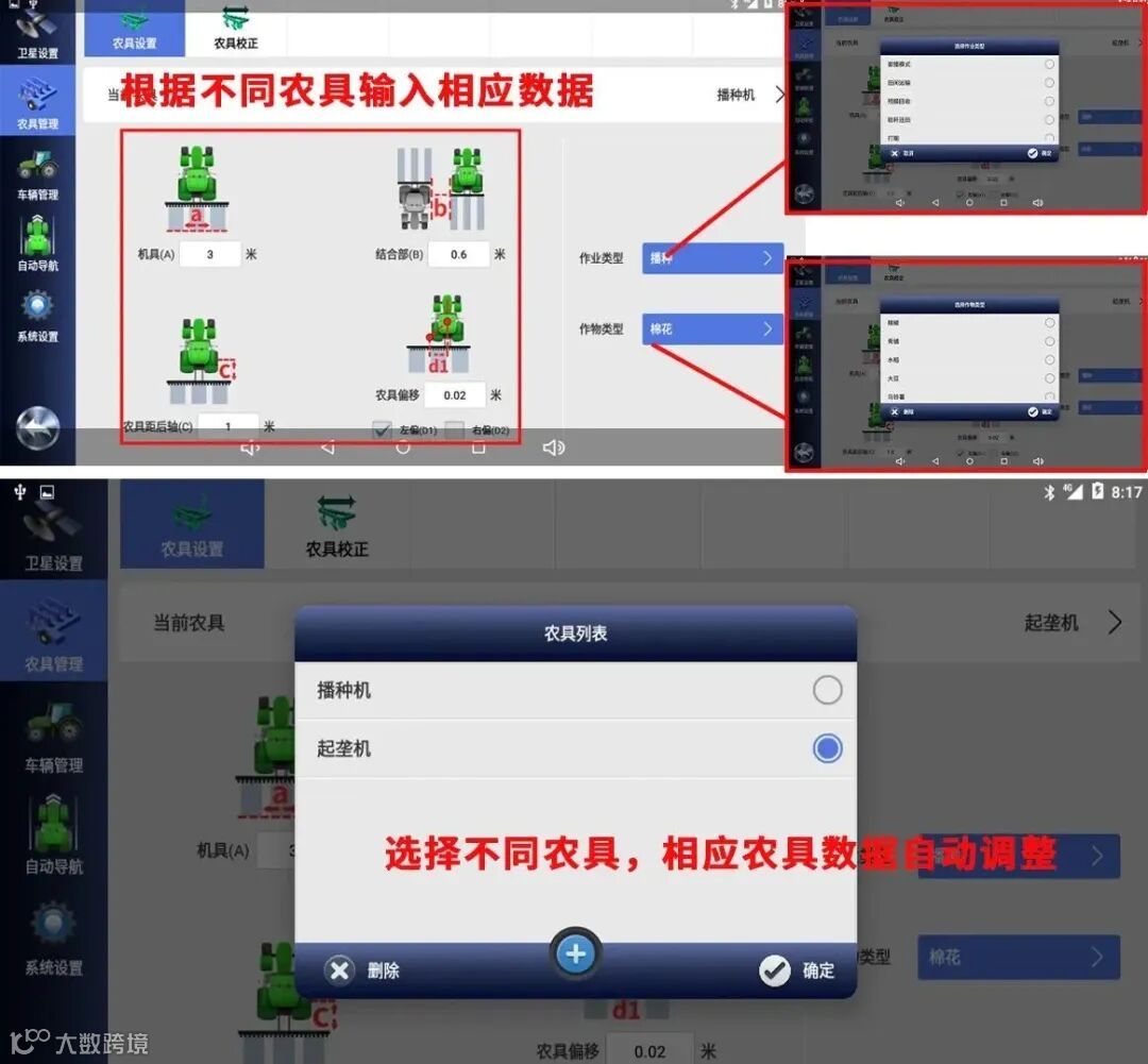 不同的作业模式需要更换不同的农具,许多用户都在为反复输入农具数据而烦恼,联适导航农具智能管理功能,只需首次输入农具数据,后续每次替换农具,相应农具数据自动调整,简单省心。