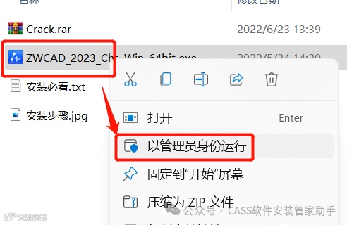 3.选中ZWCAD_2023_Chs_Win_64bit.exe,鼠标右击选择“以管理员身份运行”