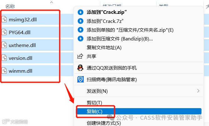 9.选中这5个文件,鼠标右键 复制。注:如果文件为空,就是被拦截掉了,关闭杀毒工具重新解压Crack即可。