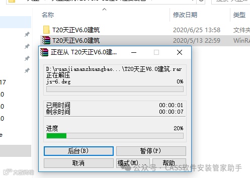 1.32位的天正T20 V6.0支持CAD2010-2019,64位的天正T20 V6.0支持CAD2010-2019,本教程以天正建筑T20 V6.0为例,电气,暖通,给排水,结构安装教程与此相同。下载软件安装包,鼠标有右击压缩包,选择【解压到T20天正V6.0建筑】。