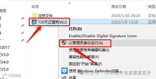 3.打开解压后的T20天正V6.0建筑文件夹,鼠标右击【T20天正建筑V6.0】安装程序,选择【以管理员身份运行】。