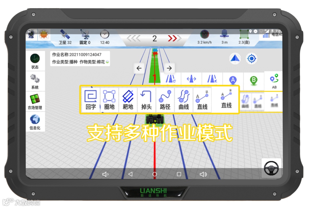 为了适应不同的作业模式,作业地形,更好的帮助用户作业,联适导航自动驾驶系统支持直线、耙地、曲线、回字、自定义路径等多种不同作业模式。