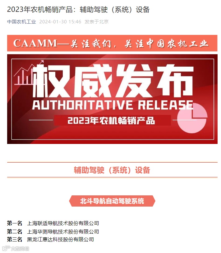 【权威发布 重磅转载】中国农业机械工业协会官方发布2023年农机畅销产品:辅助驾驶(系统)设备,联适排名第一!