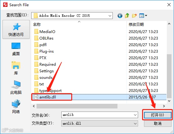 21.在打开的【Adobe ME CC 2015】文件夹中选中【amtlib.dll 】文件,点击【打开】。