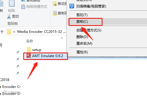 14.返回到解压后的【Adobe_MEr_CC2015】文件夹,鼠标右击【AMT Emulate 0.9.2】选择【复制】。