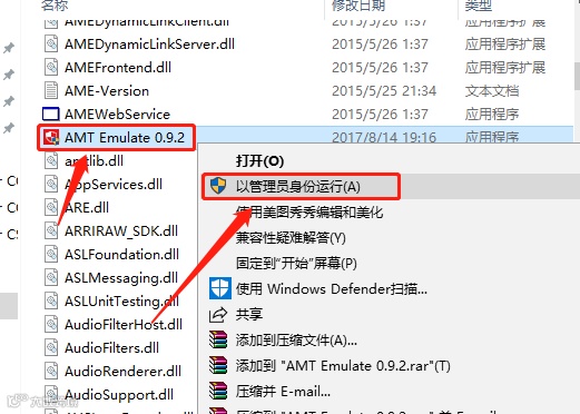 17.鼠标右击粘贴的【AMT Emulate 0.9.2】,选择【以管理员身份运行】。