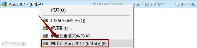 1. 关闭网络,鼠标右击软件压缩包,选择“解压到Ancc2017 (64bit)”。