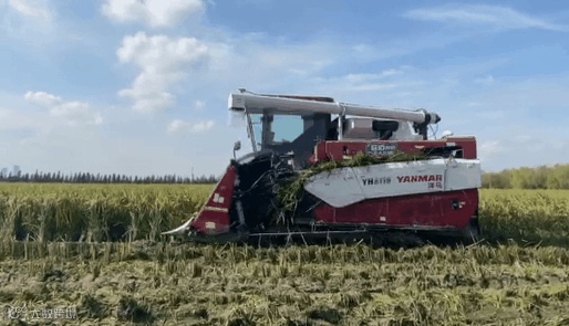 无人驾驶收割机所到之处,成熟的水稻被整齐地割断,经过脱粒、卸粮、装粮,变成一堆堆金黄色的稻粒。
