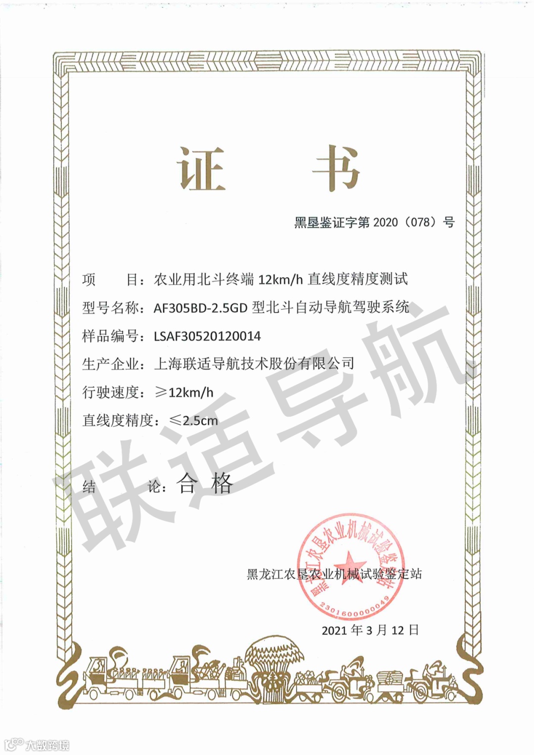 农业用北斗终端12km/h直线精度证书