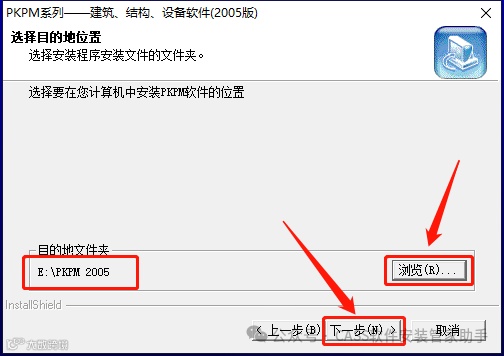 8.点击【浏览】设置PKPM2005软件的安装路径,建议安装在除C盘以外的磁盘,教程中选择安装到E盘中的一个新建的文件夹,用户可自行设置,设置好安装路径后点击【下一步】。