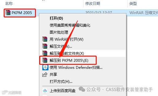 1.下载的并解压【PKPM 2005】软件安装包,鼠标右击压缩包选择【解压到PKPM 2005】。