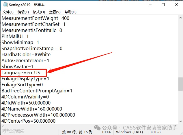 22.在打开的文本鼠标下拉找到【Language=en-US】。