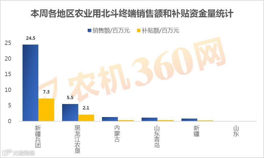 本周共有6个地区有农业用北斗终端补贴销量新增数据,共实现销售额3328万元,使用中央补贴资金1039万元。本周销售额和补贴资金使用量前三地区均是新疆兵团、黑龙江农垦和内蒙古。