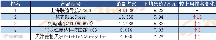 本周前五热销农业用北斗终端产品中,有1款平均售价为5.23万元的直线精度±2.5cm的电动方向盘北斗导航辅助驾驶系统;4款直线精度±2.5cm的北斗导航自动驾驶系统,平均售价从5.82万元到7.29万元不等。