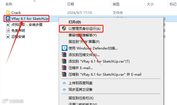 2.打开解压后文件夹,鼠标右击【VRay 6.1 for SketchUp】安装程序,选择【以管理员身份运行】。