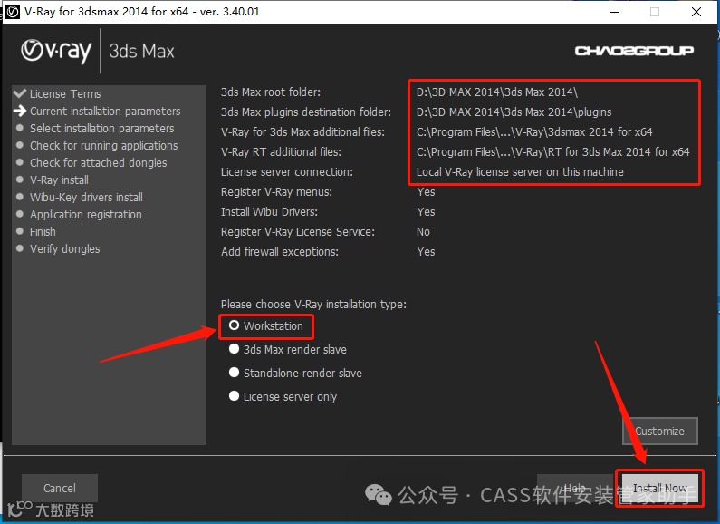 5.软件默认识别自己电脑上安装的3dmax路径,选择【Workstation】,然后点击【Install Now】。