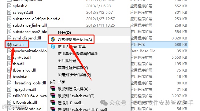 20.在当前文件夹找到粘贴的【switch】文件,鼠标右击选择【以管理员身份运行】。