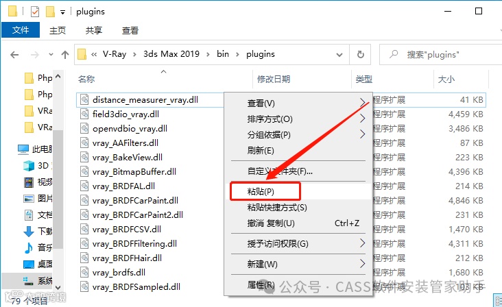13.在打开的【Plugins】文件夹中,粘贴刚才复制的【vray_v50003_fix】文件。