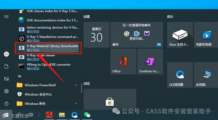 28.在桌面左下角的开始菜单中,找到并打开【V-Ray Material Library downloader】。