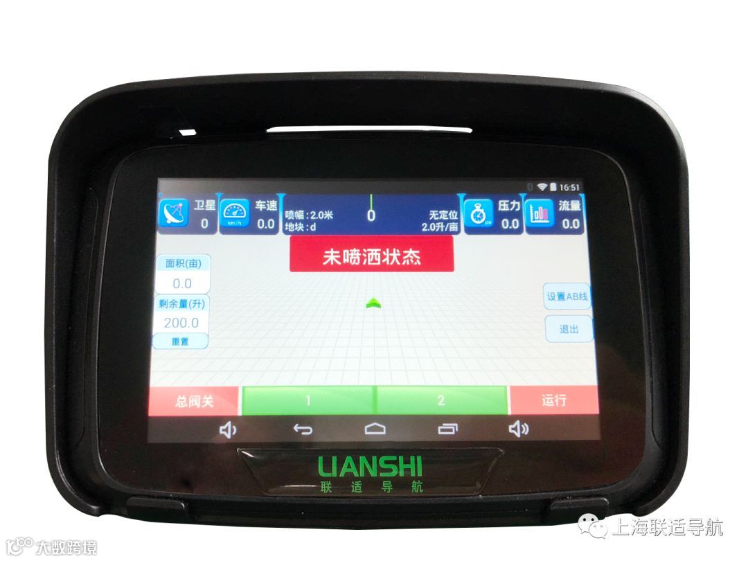 响应国家一控两减三基本政策,推动施肥打药的精确化,联适推出了精准变量喷药控制系统,系统采用北斗/GNSS卫星定位技术,实时的获取准确的速度信息,通过实时获取速度信息,并根据车速、喷幅和目标喷量等,实时自动调节喷药速率,速度快时增大喷量,速度慢时减少喷量,以确保单位面积的施药量均匀一致,可以有效避免农药过量影响作物生长或药量不足达不到防治效果。