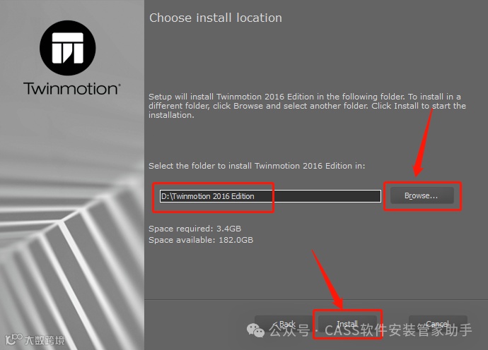 7.点击【Browse】设置Twinmotion软件的安装路径,可自行设置,教程中是直接安装到D盘,设置好安装路径后点击【Install】。