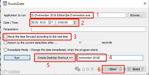 30.如下图所示,2处设置时间,3处去掉勾选,4处填写快捷图标名称,完成后点击5处,最后点击【Close】关闭窗口。
