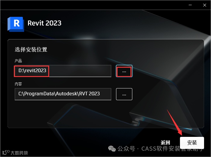 5.点击【…】选择软件安装位置(建议不要安装在C盘,可在D盘或其它磁盘下新建一个“Revit 2023”文件夹),点击【安装】。
