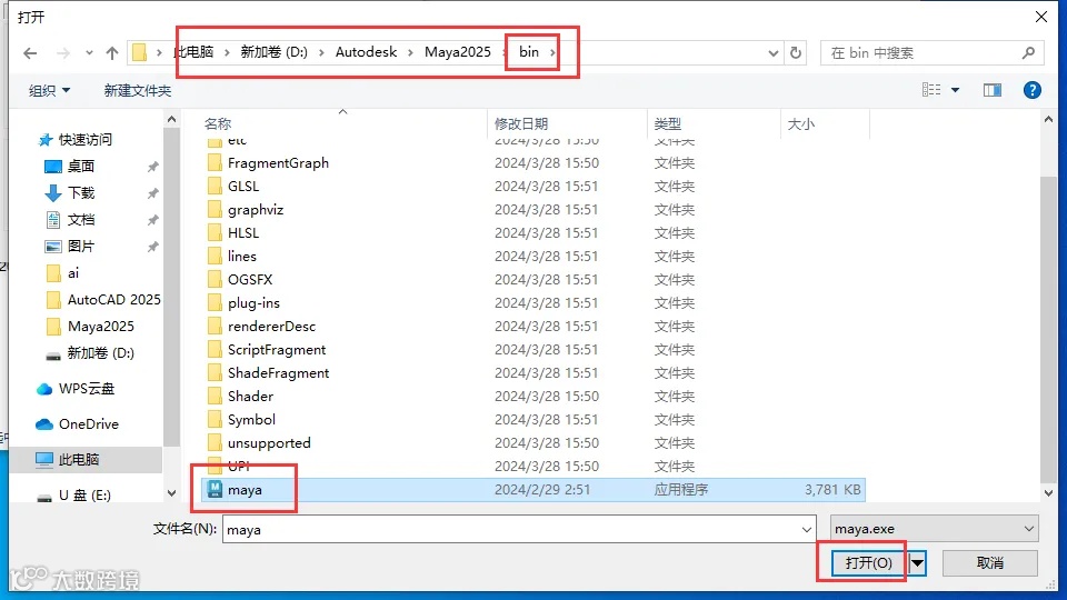 打开Maya的安装位置(步骤9更改的位置),找到bin文件夹,进去之后找到maya软件打开