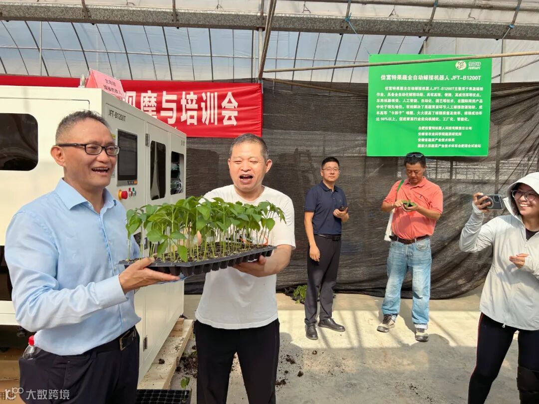 合肥佳富特林茂先董事长向到场的专家老师们重点介绍了佳富特茄果类全自动嫁接机器人。设备一键启动,自动取苗、切割、包扎、成品苗自动扦插码盘,嫁接效率1200株/小时,成功率超过98%。现场的专家老师们惊叹全自动嫁接机器人的种苗切口和贴合度,更惊叹嫁接成品苗的一致性和嫁接效率。以机替人是必然趋势,嫁接机器人的推广应用将大力促进育苗企业实现标准化、规模化、智能化发展。