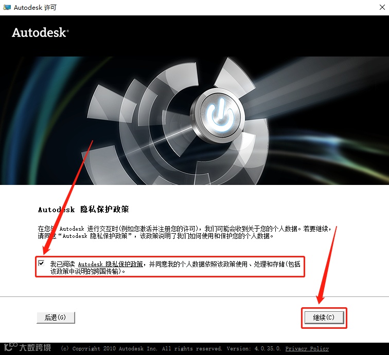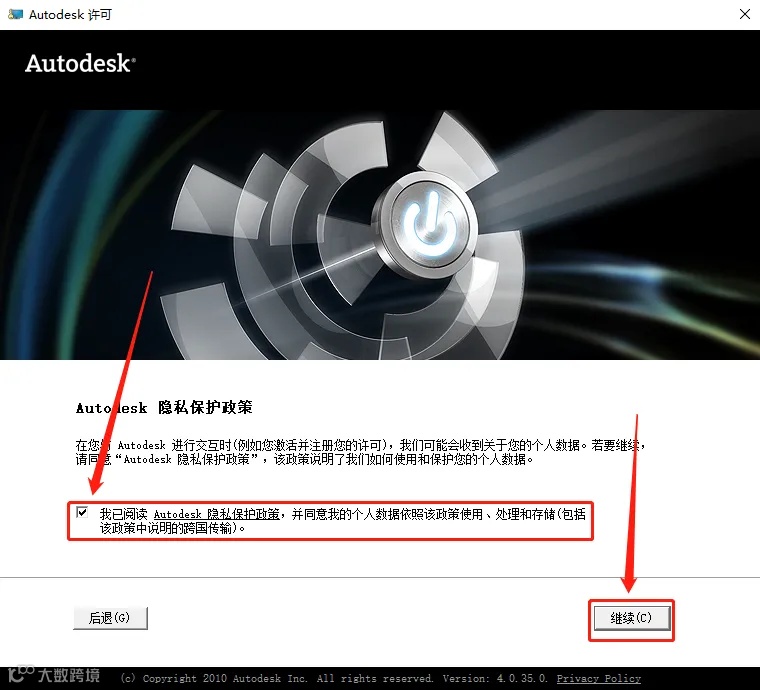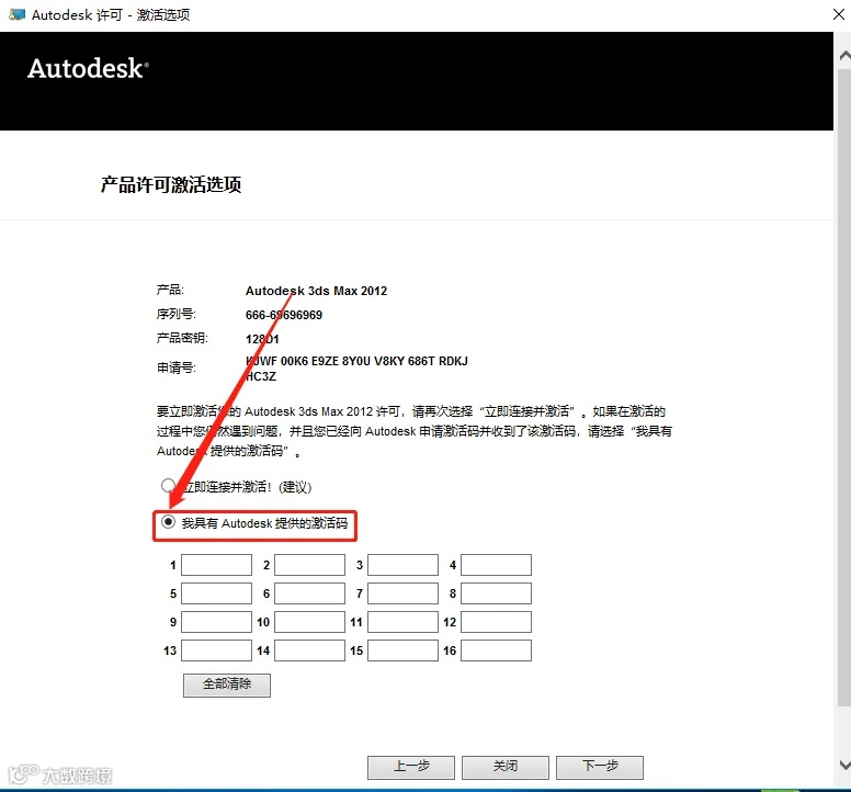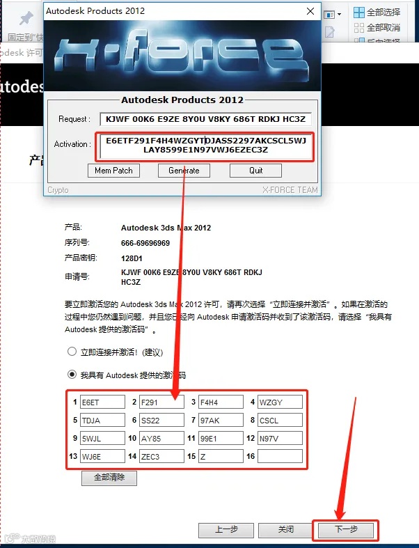 28.选中注册机中Activation方框中生成的激活码,使用ctrl+C键或者鼠标右击选择复制,然后把复制的激活码使用ctrl+V键粘贴至我具有Autodesk提供的激活码方框中,粘贴好后点击【下一步】。