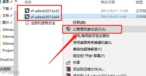 23.根据自己的电脑操作系统位数选择注册机,教程这里选择【xf1adesk2012x64】注册机,鼠标右击注册机选择【以管理员身份运行】。