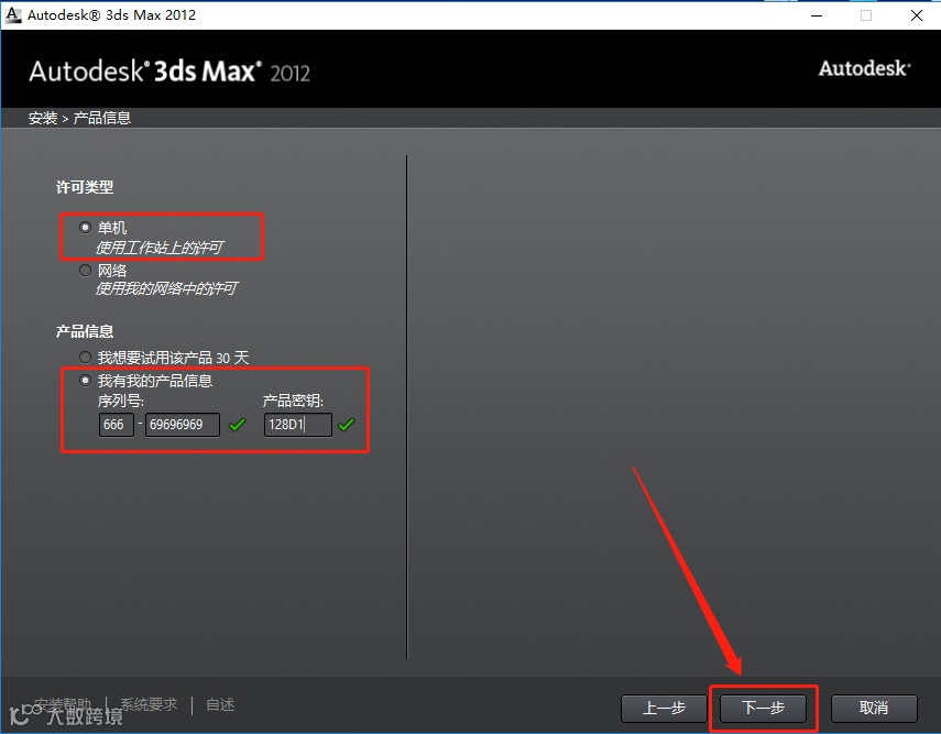 6.输入序列号:666-69696969, 667-98989898, 400-45454545,产品密钥:128D1。用户信息科随意填写,填写好后点击【下一步】。