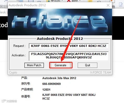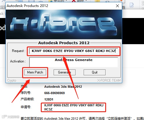 25.使用ctrl+C键复制申请号,然后使用ctrl+V键粘贴至注册机中的Request方框中,粘贴好申请号后点击【Mem Patch】。