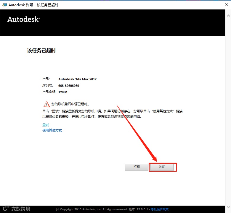 14.显示下图所示该任务已超时或者提示其它未激活,直接点击关闭即可,之后软件自动打开。